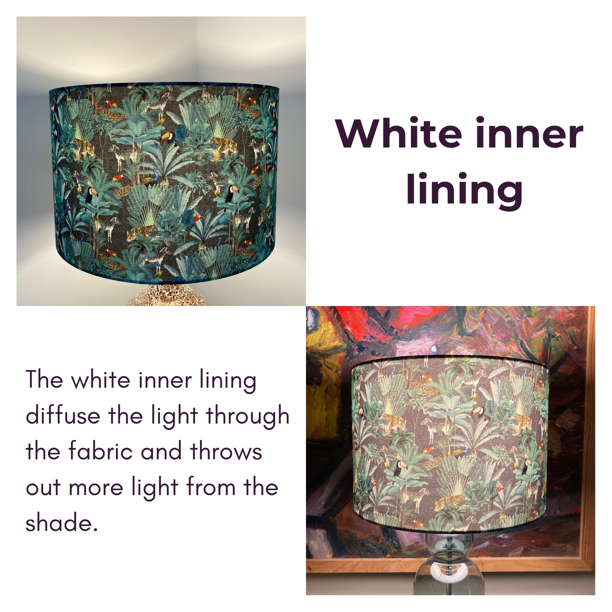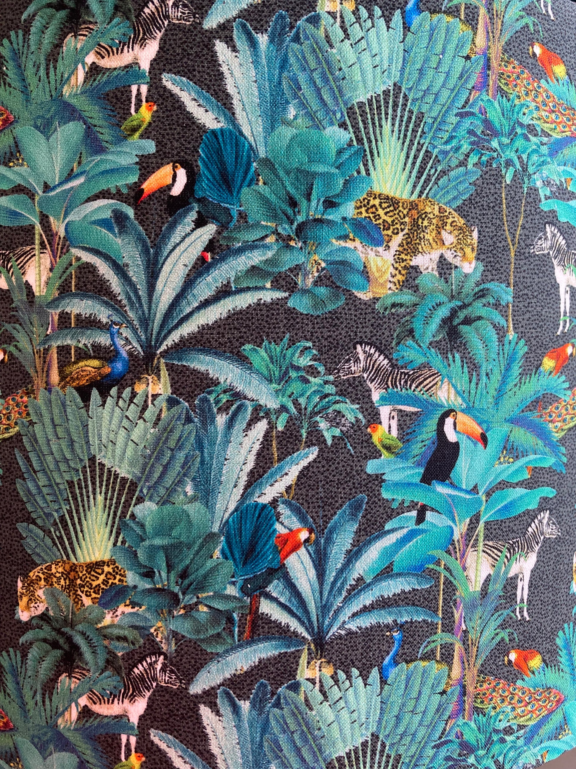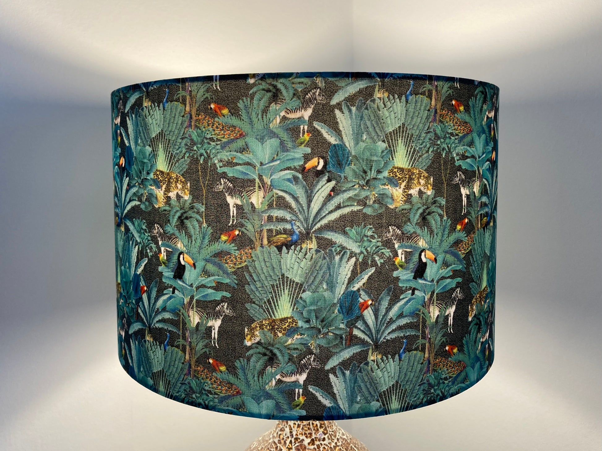 Handmade Drum Lampshade from Tropical Jungle Scenery Print Fabric Multicoloured with Dark Grey Background